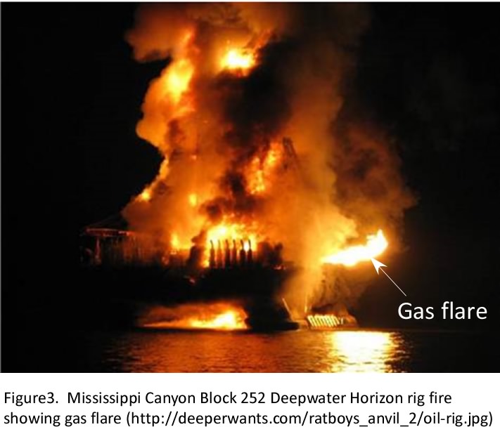 6. Sea water is much lighter than drilling mud so there was less downward force in the wellbore to balance the flow of gas from the reservoir. The drilling supervisors knew that there was gas in the drilling fluid because a gas flare can be seen in photos probably coming from a diverter line in the riser (Figure 3).