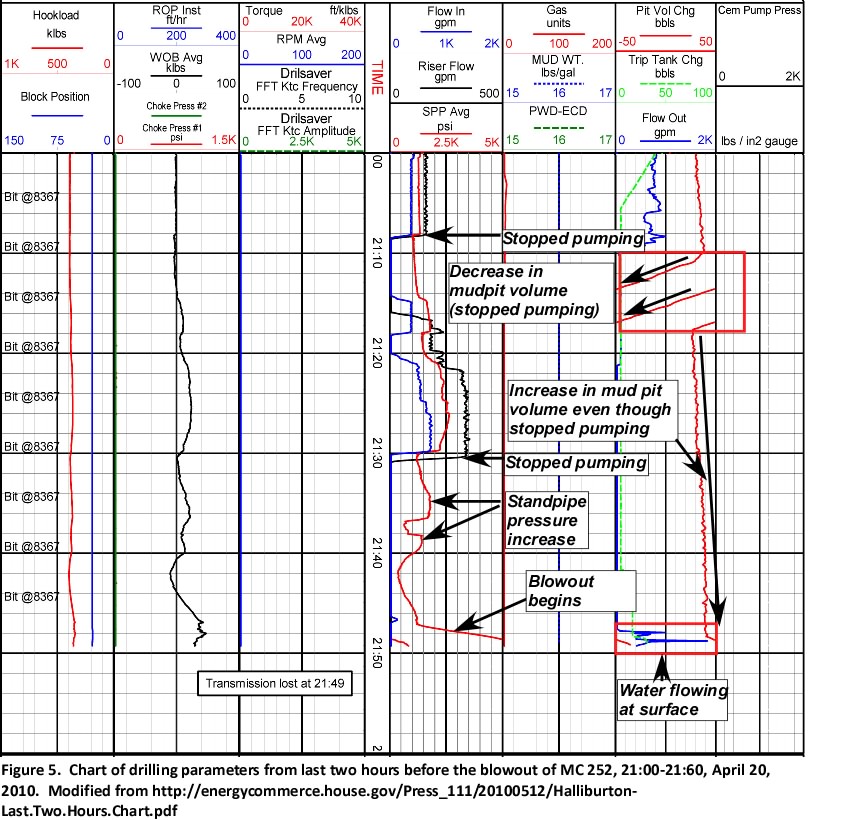 7. The chart of drilling parameters for the last two hours before the blowout suggests that the riser and upper 3,000 ft of the wellbore were fully displaced with seawater by 20:00 on April 20, and the crew was circulating the drilling fluid Beginning 10 minutes later, at 20:10, the mud pit volume began to increase probably because of gas influx (Figure 4). The volume increased so much, that the recorder re-zeroed four times. When the crew stopped pumping at 21:08, the mud pit volume decreased and this may have alleviated some concern about gas influx.